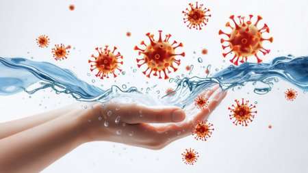 Hands being washed with flowing water while virus particles float around, representing hygiene, cleanliness, and the importance of preventing infections.