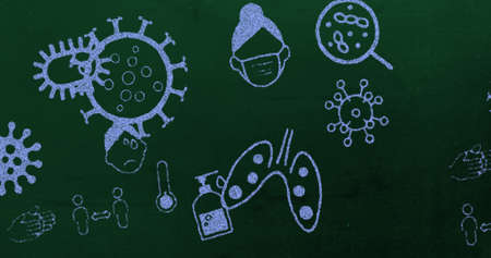Image of blue icons of people with face masks, lungs, hands and Covid 19 coronavirus cell moving on green background. Global coronavirus Covid 19 pandemic concept digitally generated image.