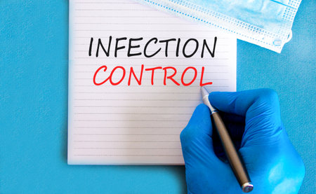 Infection control symbol. Concept words Infection control on beautiful white note. Doctor's hand in blue medical glove. Beautiful blue background. Medical healthy lifestyle infection control concept.