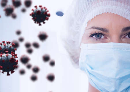 Digital illustration of macro Covid-19 cells floating over a woman wearing a face mask, looking at the camera. Coronavirus Covid-19 pandemic concept digitally generated