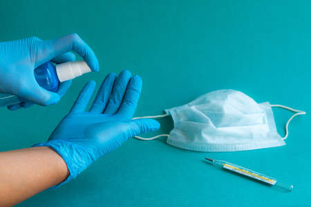 Antiseptic treatment of gloved hands, women's gloved hands, blue medical gloves, medical thermometer, medical mask, still life coronavirus. Concept of treatment of influenza virus or coronavirus.
