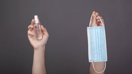 hands holding a medical blue face mask and a bottle of antiseptic for hands on a dark background. quarantine protective measure from the virus covid-19, pandemic