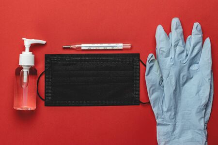 Protection covid. Medical respirator bandage face sanitizer gel, thermometer and lab gloves - Virus protection equipment on red background. Dangerous Novel virus COVID-19, pandemic risk alert