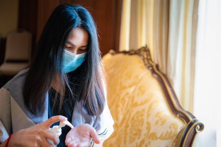 Asian woman wearing mask and alcohol antibacterial hand gel respiratory protection mask against epidemic flu covid19 or corona virus with fear emotion in concept illness, outbreak, healthcare in life