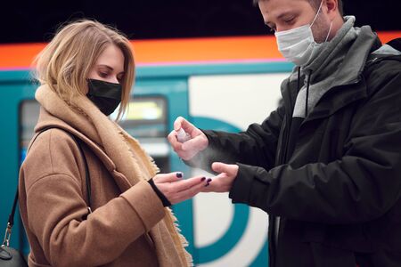 Young man and blonde woman in medical masks using antiseptic while standing near underground carriage.