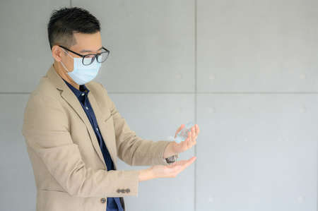 Asian businessman wearing medical face mask washing hand with alcohol gel for hygiene