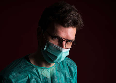 Doctor in protective medical mask. Nurse in glasses prepare for surgery. Medic disposable medical clothing against for a pandemic and flu season.