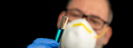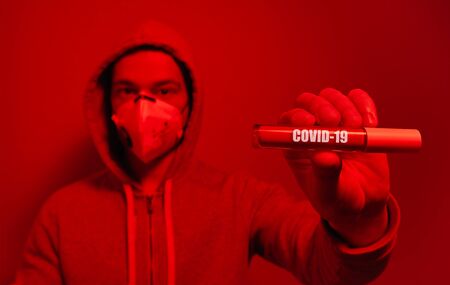 Virologist in a medical mask and protective clothing holds a test tube with positive blood sample for coronavirus testing. Pandemic covid19.