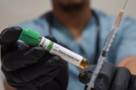 Text Diabetes Insipidus test of is written on a bottle sample with background of a doctor with a syringe in a medical glove mask. Medical concept