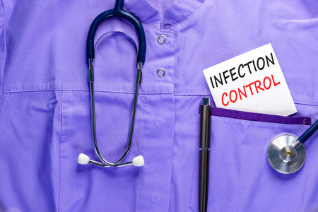 Infection control symbol. Concept words Infection control on beautiful white card. Stethoscope and pen. Beautiful medical uniform. Medical healthy lifestyle infection control concept.