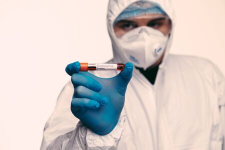 Doctor in protective wear holding test tube with blood for Coronavirus COVID-19 analyzing. Vaccine from, flu, coronavirus, ebola.