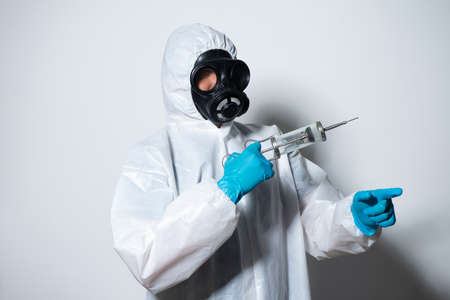 A doctor wearing a Protection suit with a gas mask against COVID-19 (Coronavirus) holding syringe and vaccine on white background