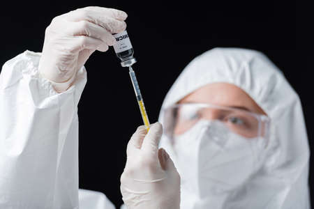 blurred immunologist in hazmat suit holding syringe and covid-19 omicron variant vaccine isolated on black