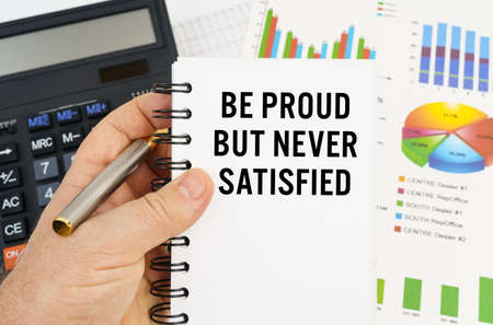 Finance and economics concept. The man is holding a pen and a notebook with the inscription - BE PROUD BUT NEVER SATISFIED. In the background are financial charts, charts and a calculator.