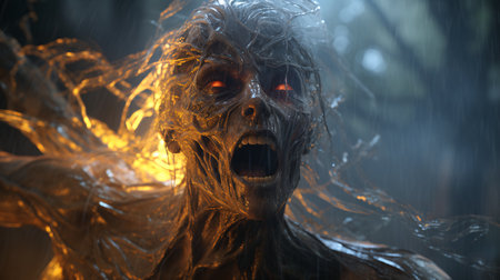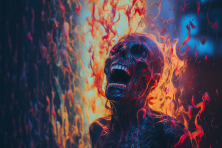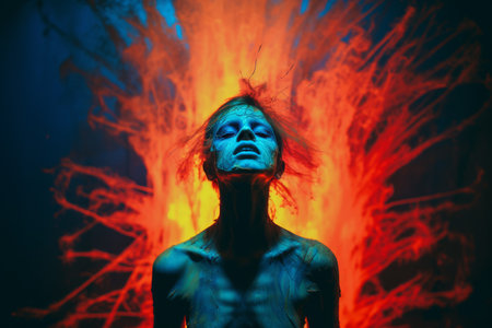 A figure stands in the dark, enveloped by flames and electric sparks, exuding raw power as it lets out a primal scream filled with intense emotion.