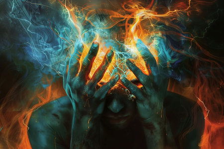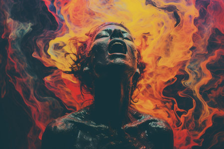 A person with their head seemingly engulfed in bright, fierce flames, representing intense passion or turmoil against a dark background.