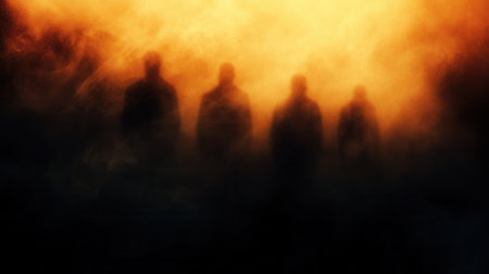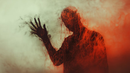 A shadowy figure stands against a smoky backdrop with red and white hues, creating a mysterious and eerie atmosphere in a dimly lit space