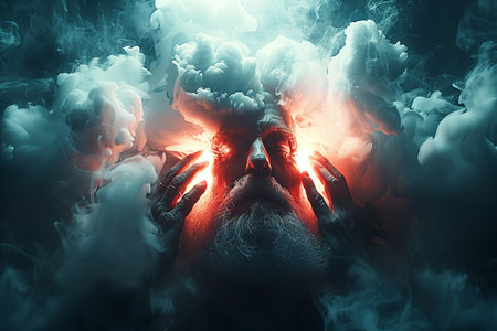 A dramatic portrait of a man with an overlay of fire and smoke effects, creating a powerful and intense visual impact.