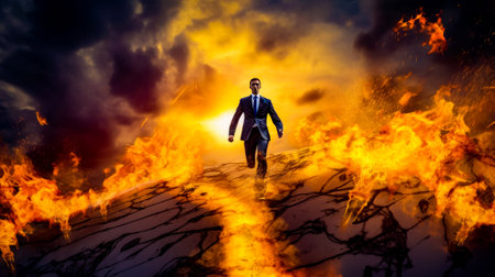 Man in suit is walking through fire-filled field with flames. Generative AI.