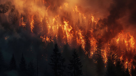 A dramatic image capturing the ferocity of a raging fire engulfing a vast woodland area, creating an intense atmosphere of destruction and danger.