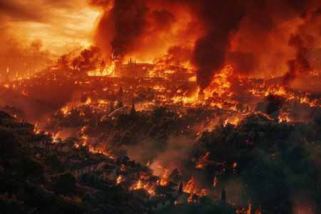 Dramatic landscape of a city engulfed in flames during a massive fire, with dark smoke rising against a fiery sky
