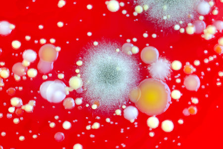 Mold colonies on red background