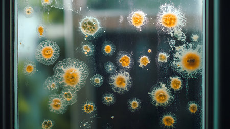 bus cabin with bacteria growing on the window, creating intricate patterns and shapes, created with generative ai