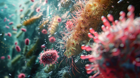 Microscopic close up of bacteria interacting with teeth in a detailed biological environment