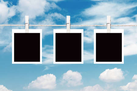 Five blank photo prints in a row on a wood desk or table. Space for copy. Paths provided.