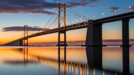 A bridge silhouetted against a twilight sky, its reflection shimmering in the calm water below.