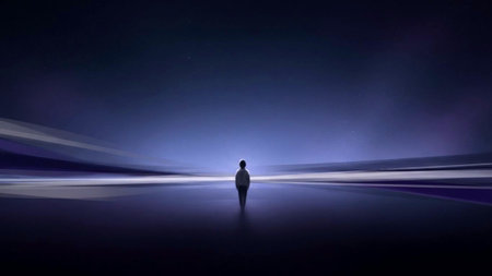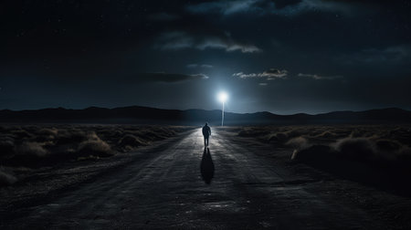 Silhouette on a vast foggy path with blurred lights, surreal landscape