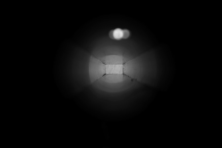 A long, dark tunnel with a glowing path and bright lights in the distance