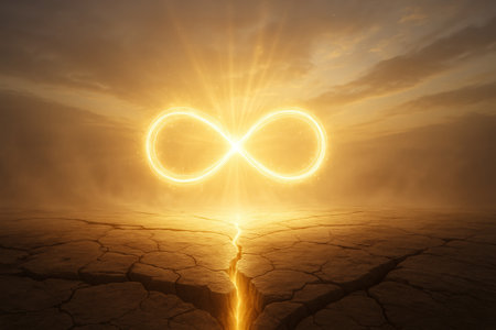 Horizontal scene of a golden infinity symbol floating above dry, arid ground. Metallic gold tones contrast with cracked desert soil, creating a powerful concept of eternity, resilience, strength, and endless potential in harsh environments.