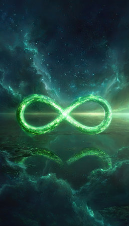 An illuminated green infinity symbol is centrally featured against a dark backdrop. The visual characteristics include a glowing effect, a reflection, and a textured style suggesting a sense of depth. The artwork may be used for various design projects, including digital art or illustrations, conveying concepts such as eternity and limitless potential.