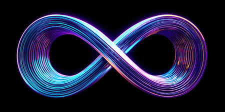 An abstract representation features an infinity symbol composed of glowing neon lights. The artwork showcases dynamic curves and gradients of pink, purple, and blue against a black backdrop. This graphic style, with its focus on light and form, could be suitable for digital art, design projects, and visual concepts.