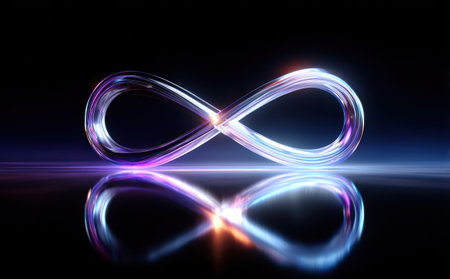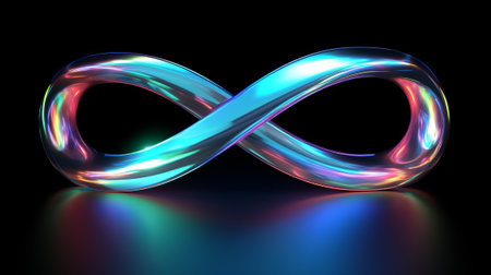 A glowing, iridescent infinity symbol, reflecting on a polished, black surface