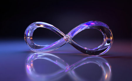 A luminescent infinity symbol with a glassy texture casts a reflection on a dark, glossy surface