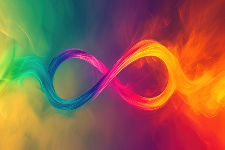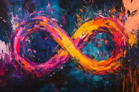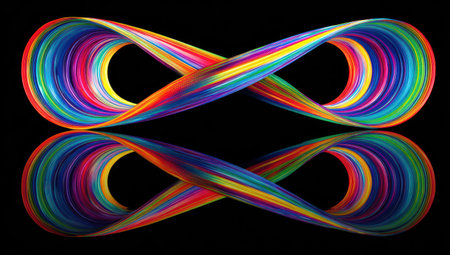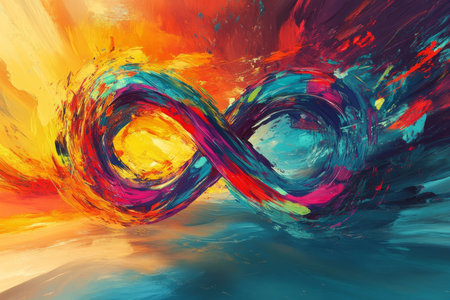 A vibrant, swirling infinity symbol rendered in a spectrum of colorful brushstrokes with reflection