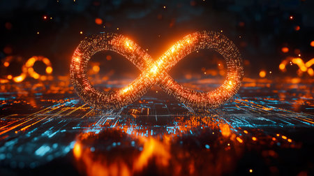 A glowing neon infinity symbol against a dark backdrop, with a futuristic, digital feel, representing endless possibilities and innovation.