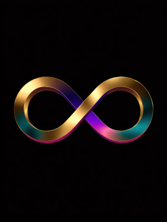 A gold and purple gradient infinity symbol shines on a black background, symbolizing limitless possibilities and creativity.