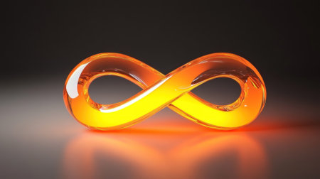 An abstract composition features an infinity symbol illuminated with orange and silver hues. Spherical objects are positioned around the symbol, reflecting light on a dark, reflective surface. The image presents a futuristic concept, potentially suitable for design, technology, or conceptual projects. The scene is illuminated by diffused lighting.