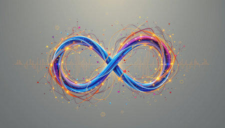 This captivating abstract illustration features an infinity symbol rendered with colorful light trails and sparkling effects, set against a soft gray background, symbolizing endless possibilities and creativity.