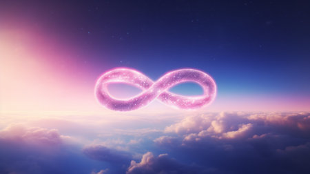 A glowing infinity symbol floats among clouds in a beautiful sunset sky, evoking a sense of eternity, infinite possibilities, and the wonder of the cosmos, highlighting the limitless nature of existence. Infinite.
