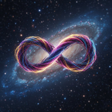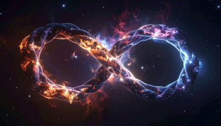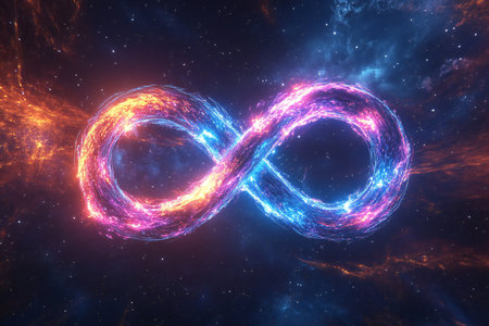 A 3D glowing infinity symbol composed of intertwining neon lights, floating in a vast cosmic space, created by ai