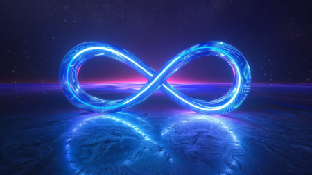 A vibrant infinity symbol glows with neon lights against a starry night sky, symbolizing eternity and the infinite possibilities of the universe.