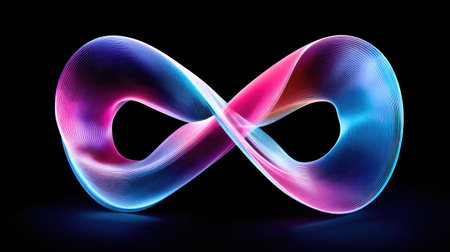 An abstract infinity symbol is presented against a stark black backdrop. It's rendered in vibrant neon colors, primarily pink and blue, with gradients suggesting depth and dimension. The image's clean lines and modern design lend themselves to various creative and commercial applications. The artwork implies concepts of eternity and continuous flow.