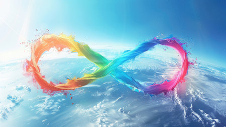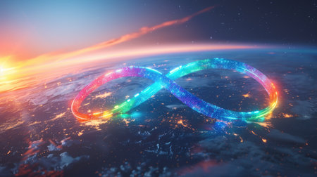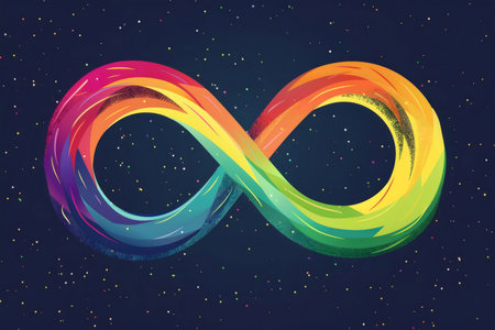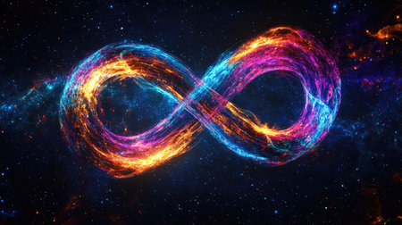 A vibrant rainbow infinity symbol set against a backdrop of stars. An abstract representation of eternity.