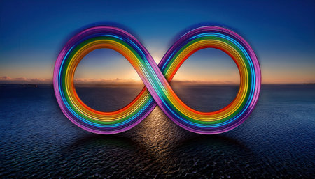 A glowing rainbow infinity symbol in the sunset ocean represents eternal love and inclusivity.