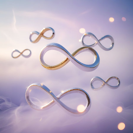 Several metallic infinity symbols, some gold and silver, float in a soft purple and blue misty atmosphere with glowing bokeh lights.