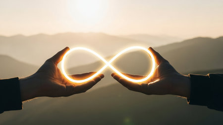 Two hands holding a bright glowing infinity symbol against a scenic mountain landscape during sunrise or sunset